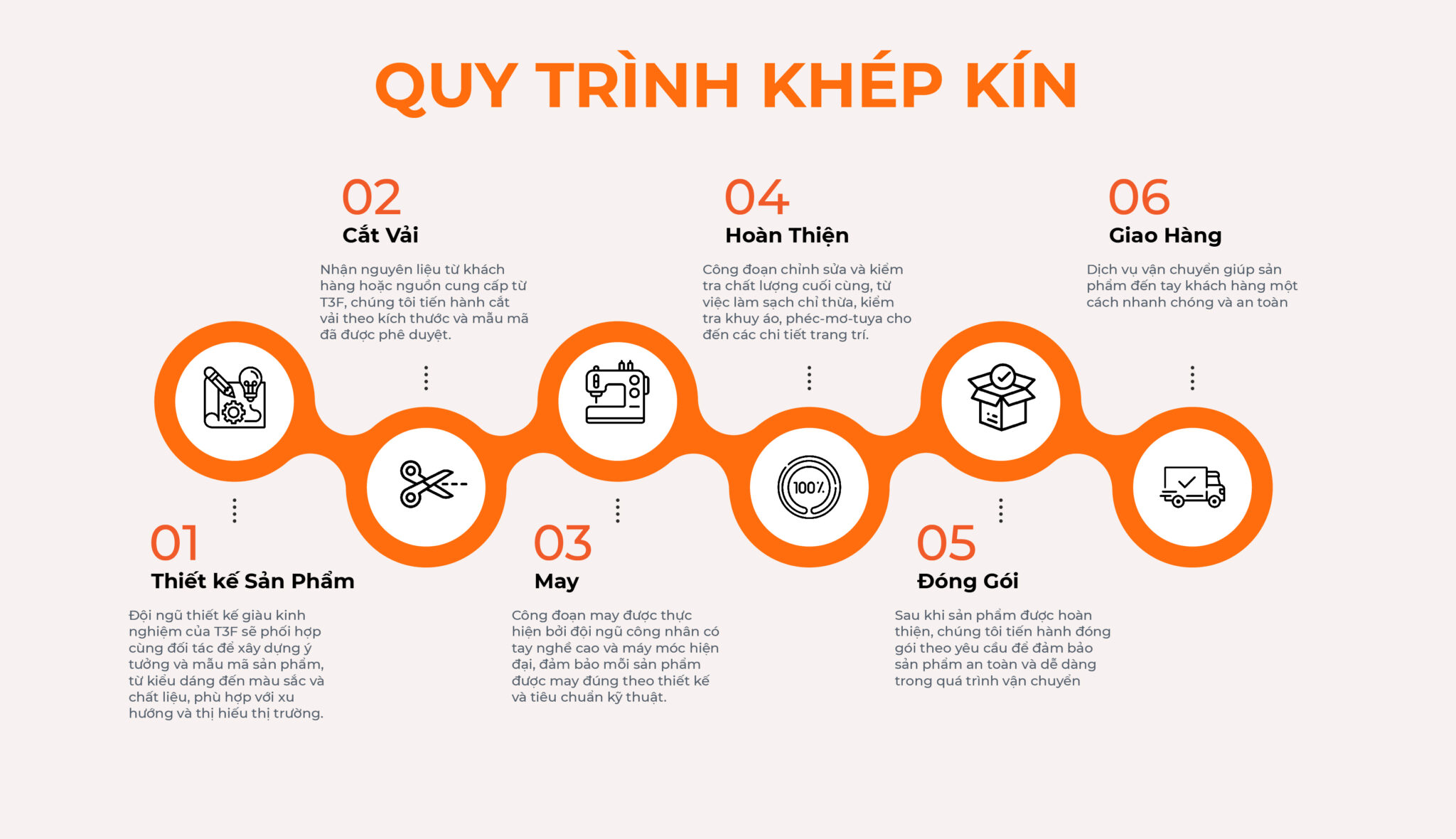 Xưởng may T3F cam kết cung cấp dịch vụ gia công CMPT,FOB chuyên nghiệp, với quy trình sản xuất tối ưu, linh hoạt, và đáp ứng nhanh chóng mọi nhu cầu của đối tác. Chúng tôi đảm bảo chất lượng sản phẩm vượt trội, đáp ứng đầy đủ các yêu cầu kỹ thuật từ cắt may, hoàn thiện đến đóng gói, mang lại giá trị cao nhất cho khách hàng.